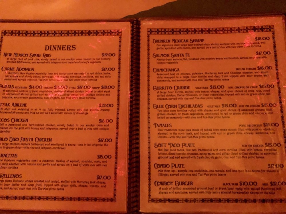 Marinated pork cubes simmered in red chiles, herbs, and spices, garnished with cheese, tomatoes, scallions, and red chile sauce and served with house rice and pinto beans